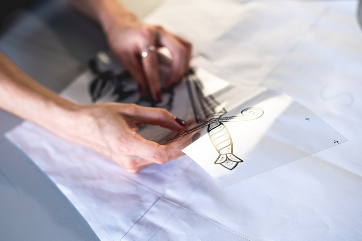 The transparency with your design is placed on the screen and exposed to UV light through a special machine